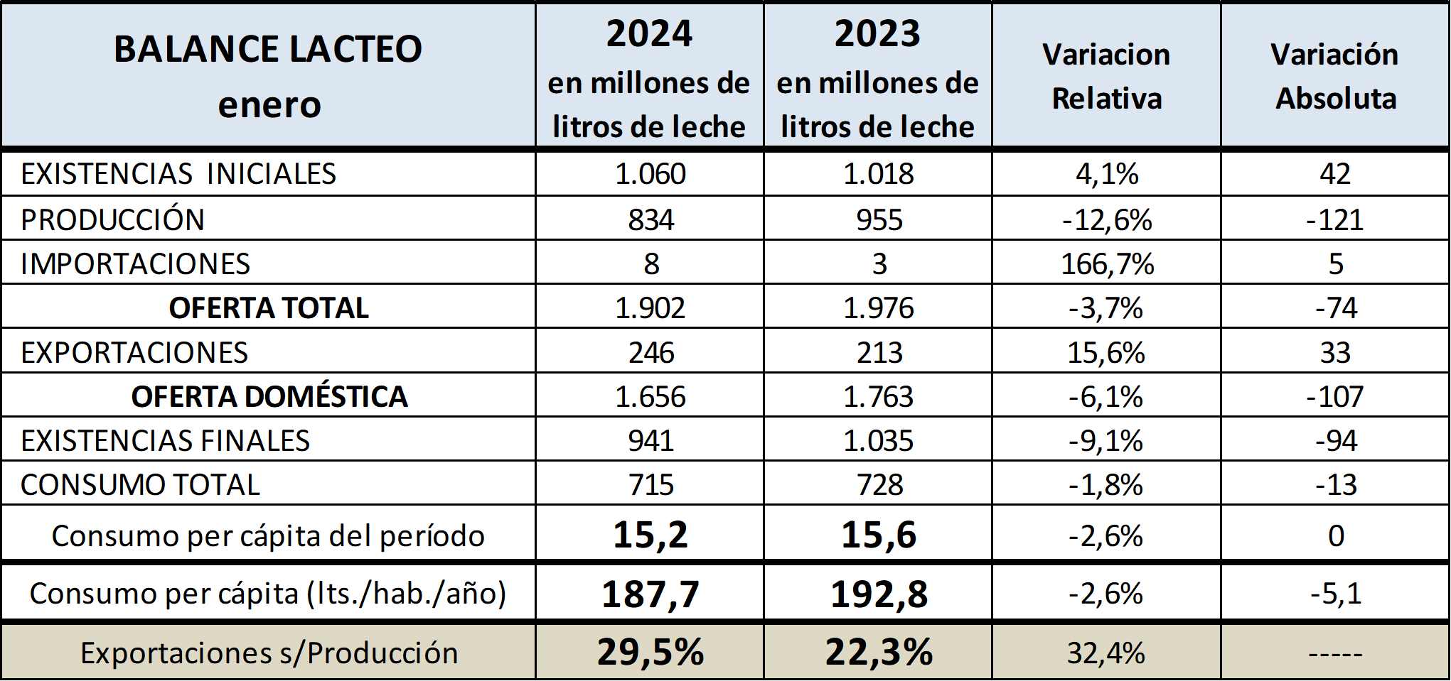 Las exportaciones registraron un aumento del 15,6% en enero de 2024. Se exportaron 246 millones de litros de leche, frente a los 213 millones de litros del mismo mes del año anterior.