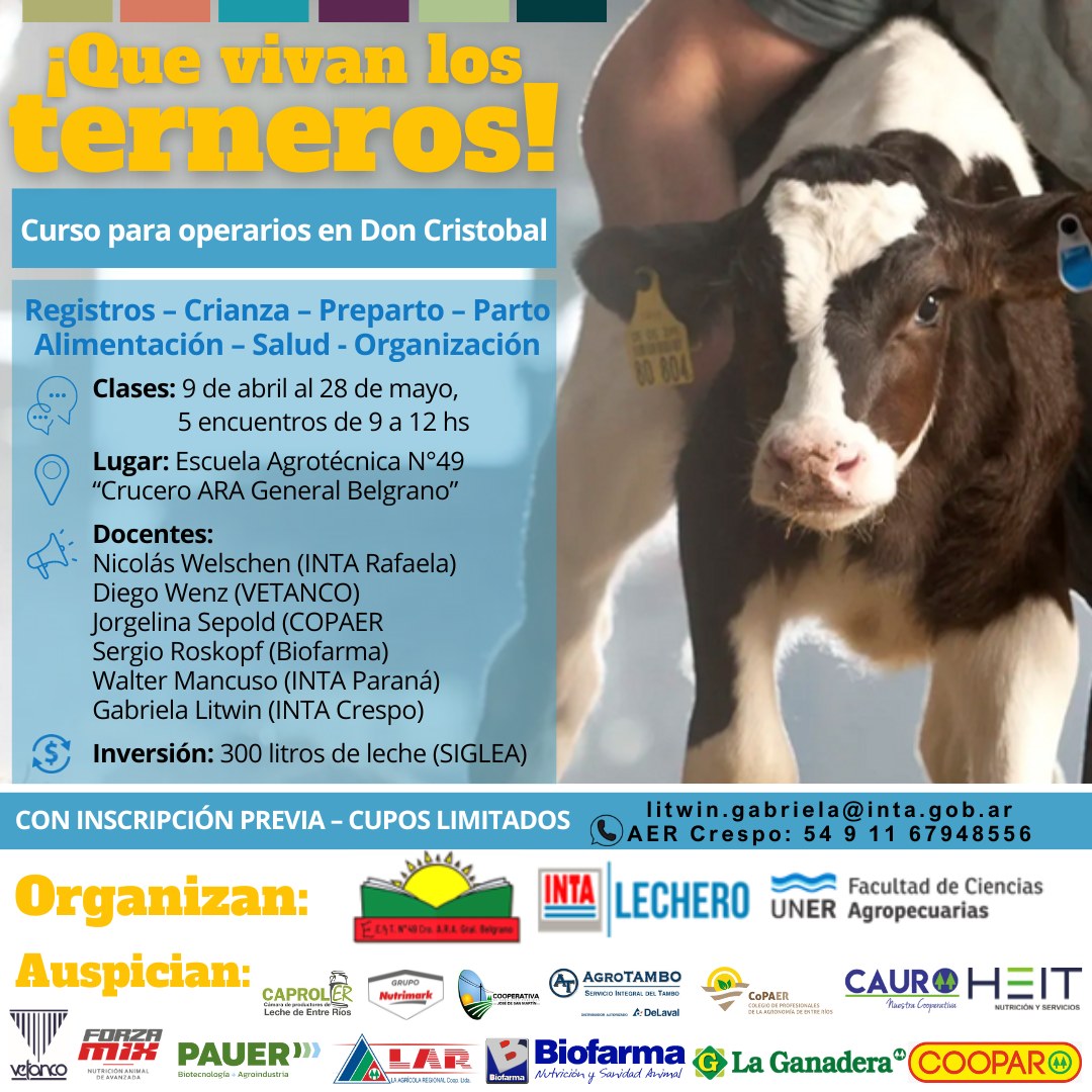 El INTA Crespo anunció una nueva capacitación teórico-práctica para operarios ganaderos en Don Cristóbal, Entre Ríos. La misma se desarrollará del 9 de abril al 28 de mayo, con un total de 5 encuentros de 3 horas cada uno, de 09:00 a 12:00 horas.