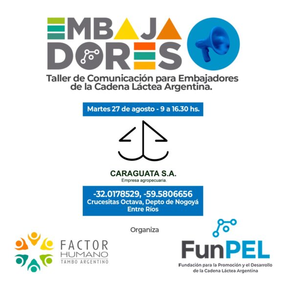 El pasado martes 27 de agosto, Sergio Borré, presidente de Caproler, junto a la Ingeniera Agrónoma Andrea Lisasso, gerente de la Cámara de Productores de Leche de Entre Ríos, participaron en el Taller de Comunicación para Embajadores de la Cadena Láctea Argentina. El evento, organizado por la Fundación para la Promoción y el Desarrollo de la Cadena Láctea Argentina (FunPEL) y Factor Humano, tuvo lugar en las instalaciones de Caraguatá S.A., en el Departamento de Nogoyá, Entre Ríos.