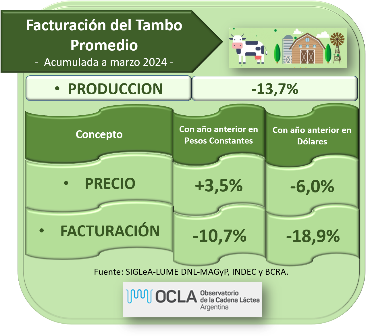 El tambo promedio que en mayo próximo pasado tuvo una producción diaria de 2.601 litros, facturó en los primeros 5 meses del año 2024 un 10,7% menos que el año anterior, debido a la caída del 13,7% de la producción y una mejora del precio del 3,5%, con lo cual le faltan en sus ingresos $ 16 millones medidos en moneda constante en los primeros 5 meses del año.