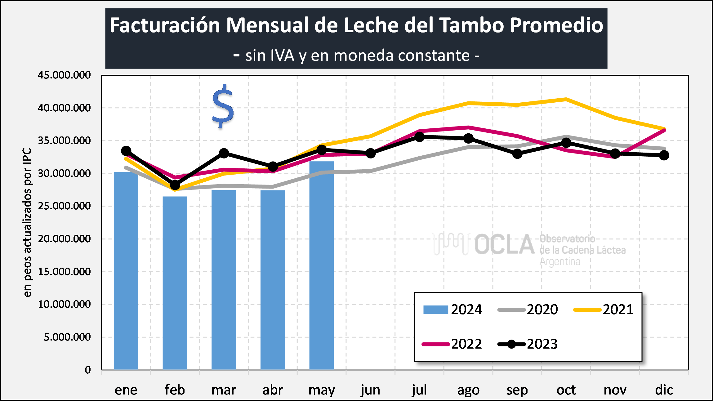 Se toma la producción mensual del tambo medio que surge de SIGLeA-LUME, se la multiplica por el precio promedio y se la actualiza con el IPC.