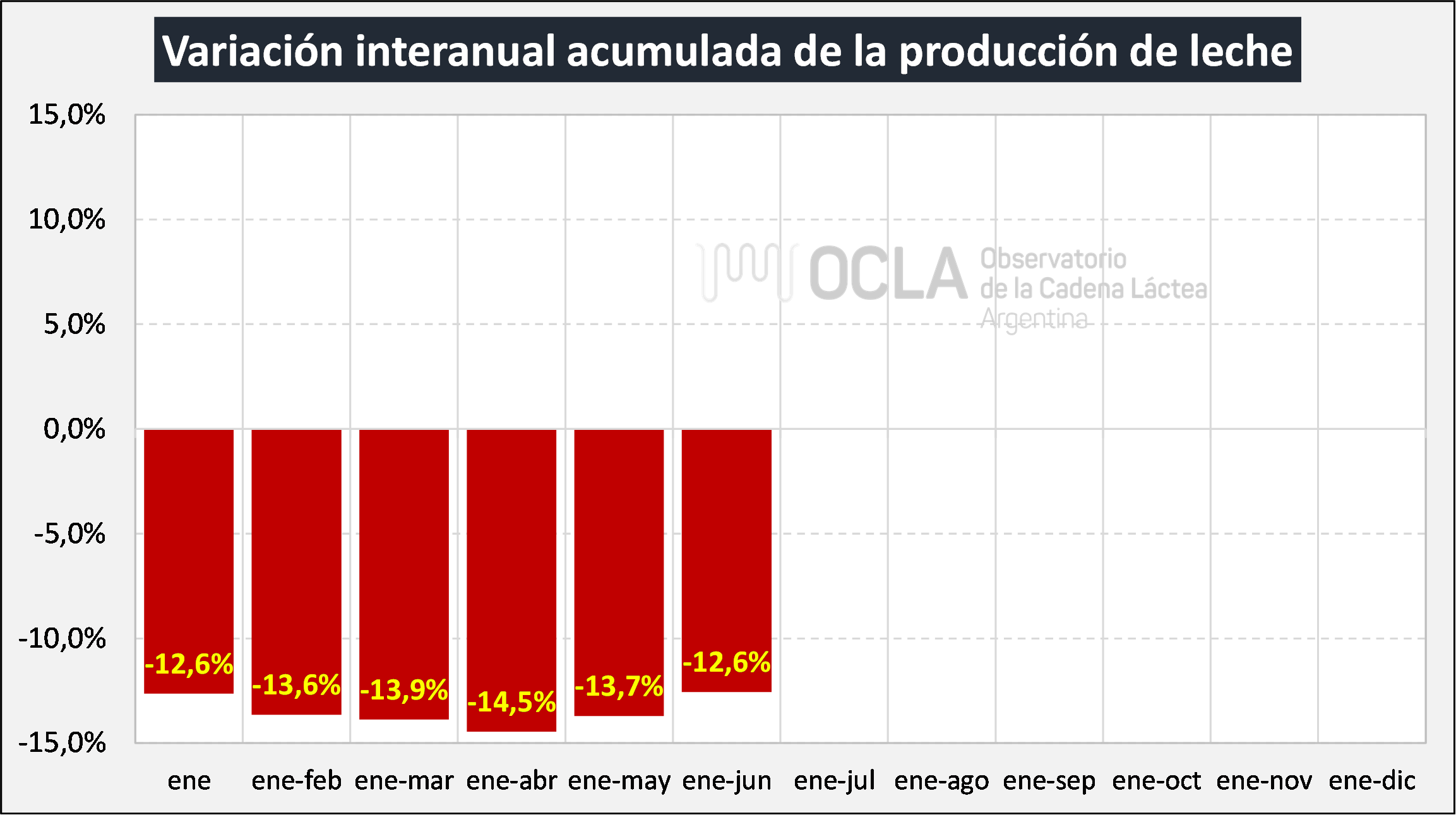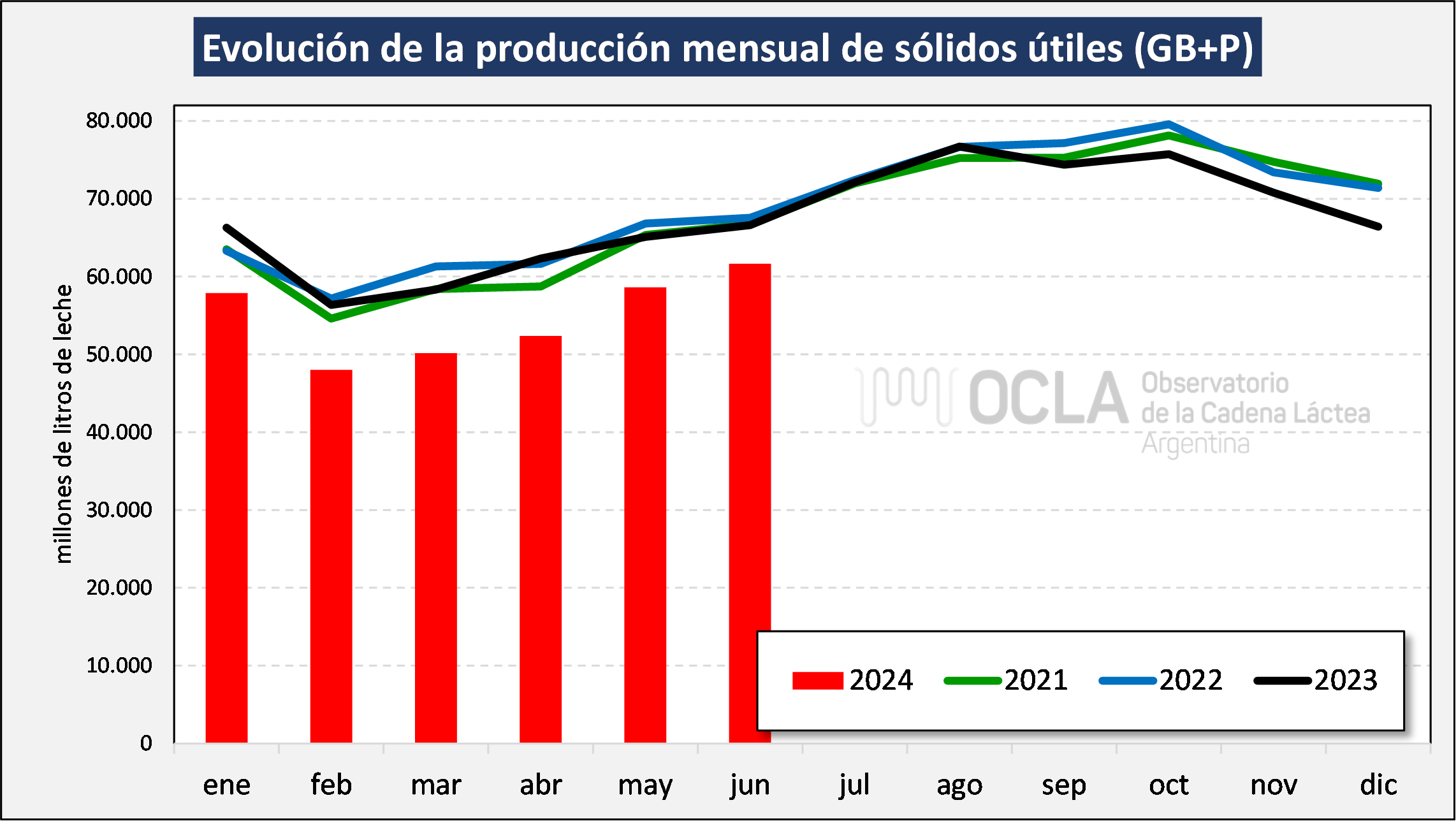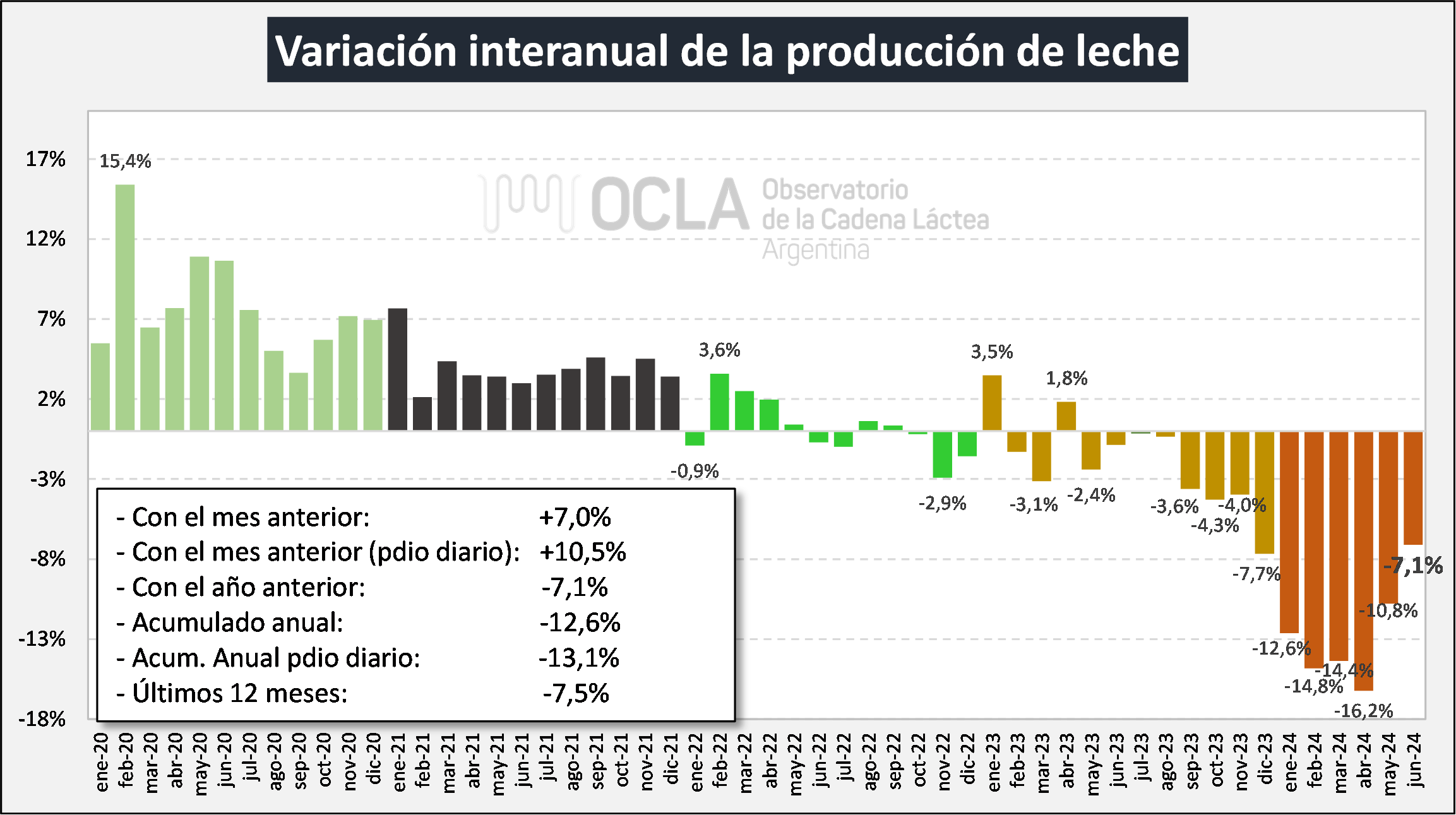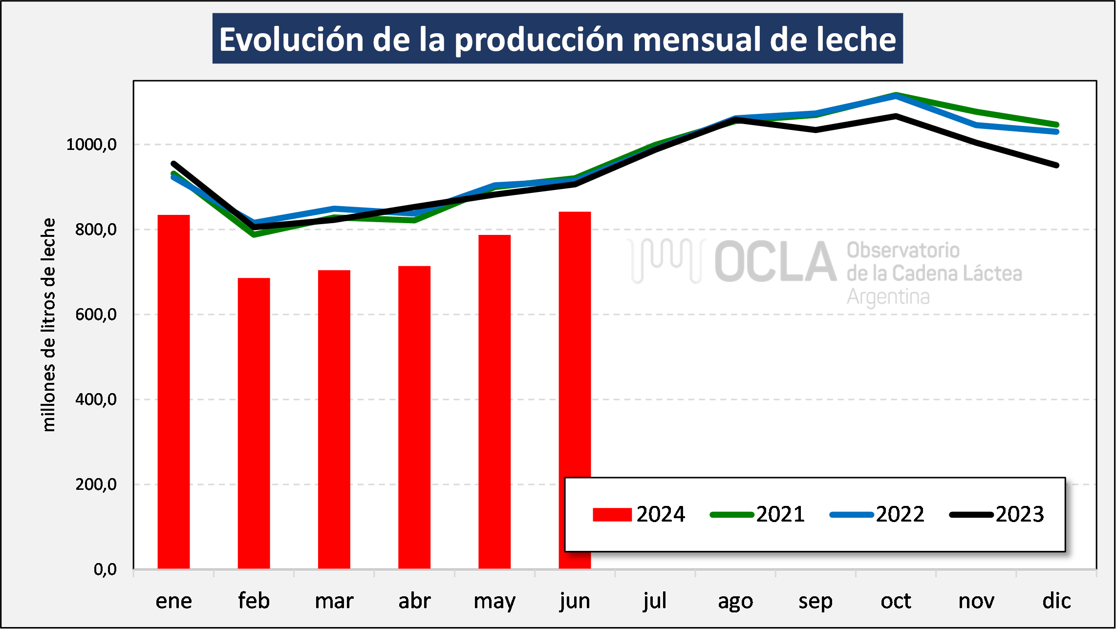 En el mes de junio del 2024 la producción fue de 842 millones de litros de leche, esto implica un valor 7,0% por encima del mes anterior (+10,5% en el promedio diario) y un 7,1% menos que igual mes del año anterior, según datos publicados hoy por el Observatorio de la Cadena Láctea Argentina (OCLA).