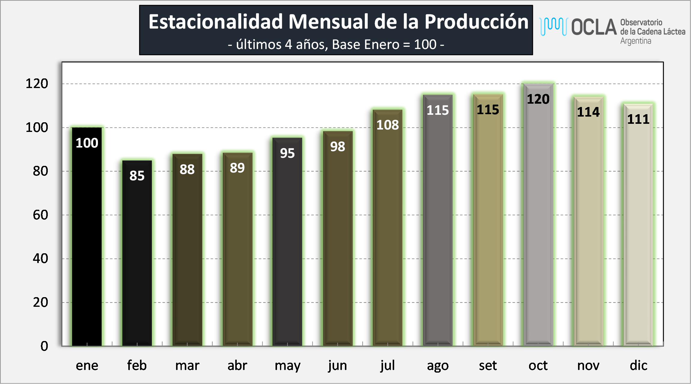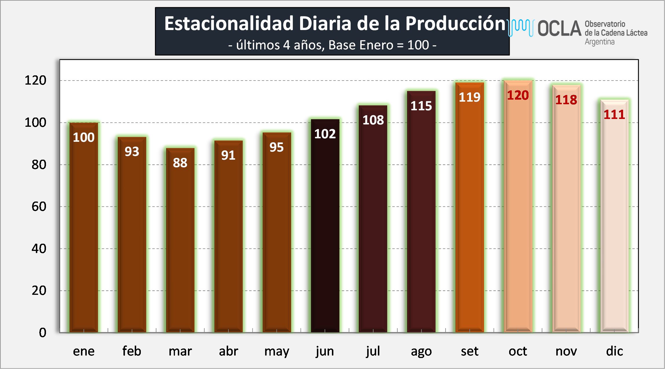 Como es habitual, la producción desde el pico de máxima en octubre, cae a una tasa del 5% mensual hasta marzo/abril (tomando el promedio diario de producción, para que no afecten la cantidad de días de cada mes), donde luego comienza un nuevo repunte hacia octubre.