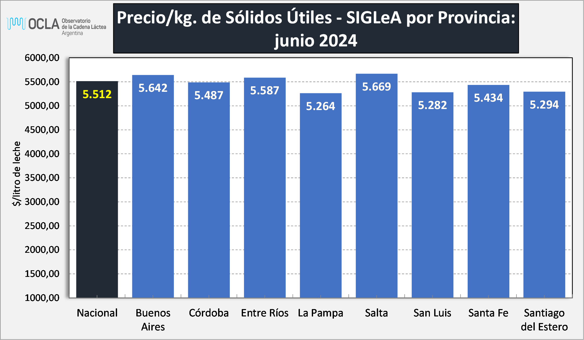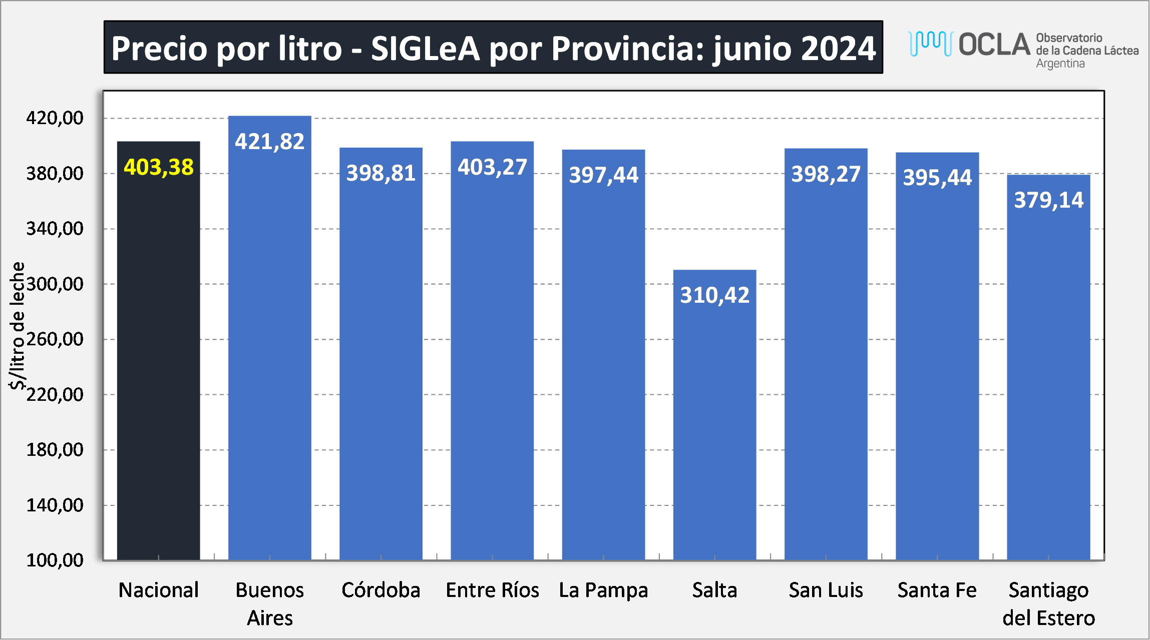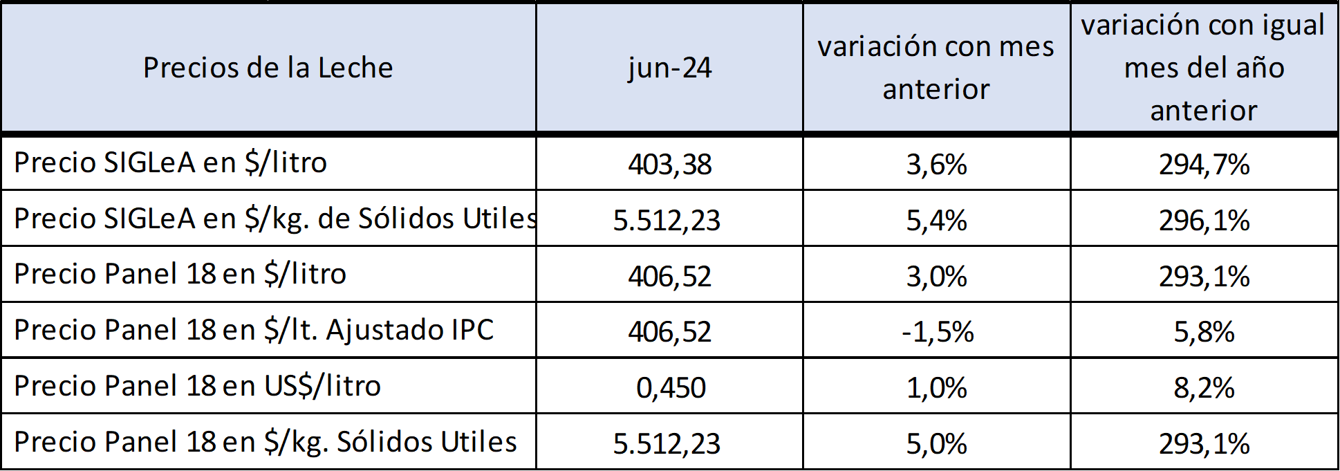 El Observatorio de la Cadena Láctea Argentina (OCLA) publicó los precios de la leche al productor para junio de 2024. El precio SIGLeA se situó en US$ 0,412 por litro, con un promedio de $978,73.