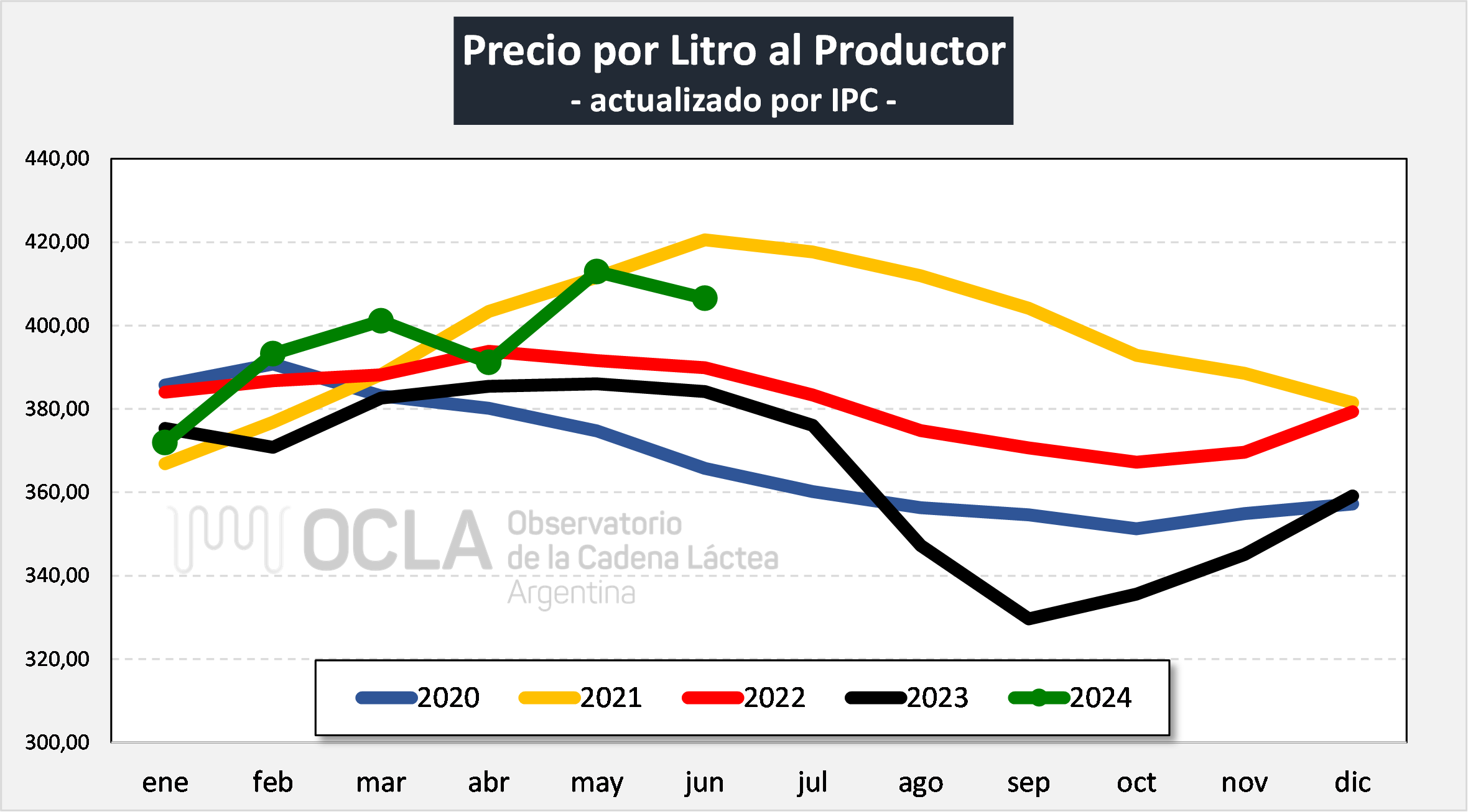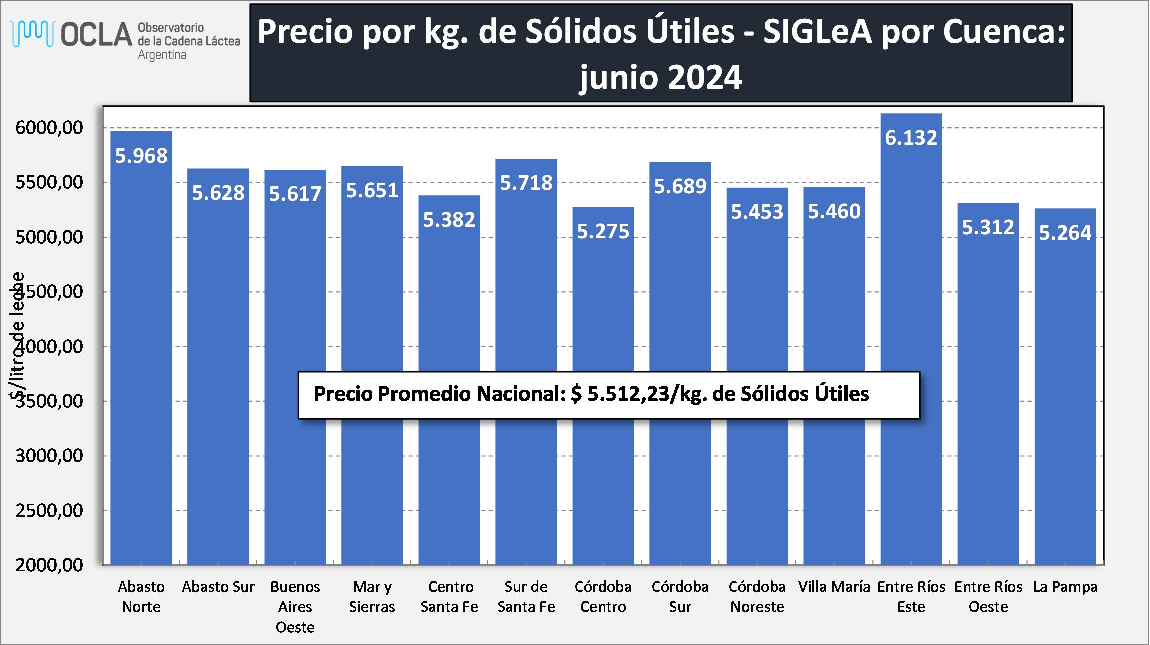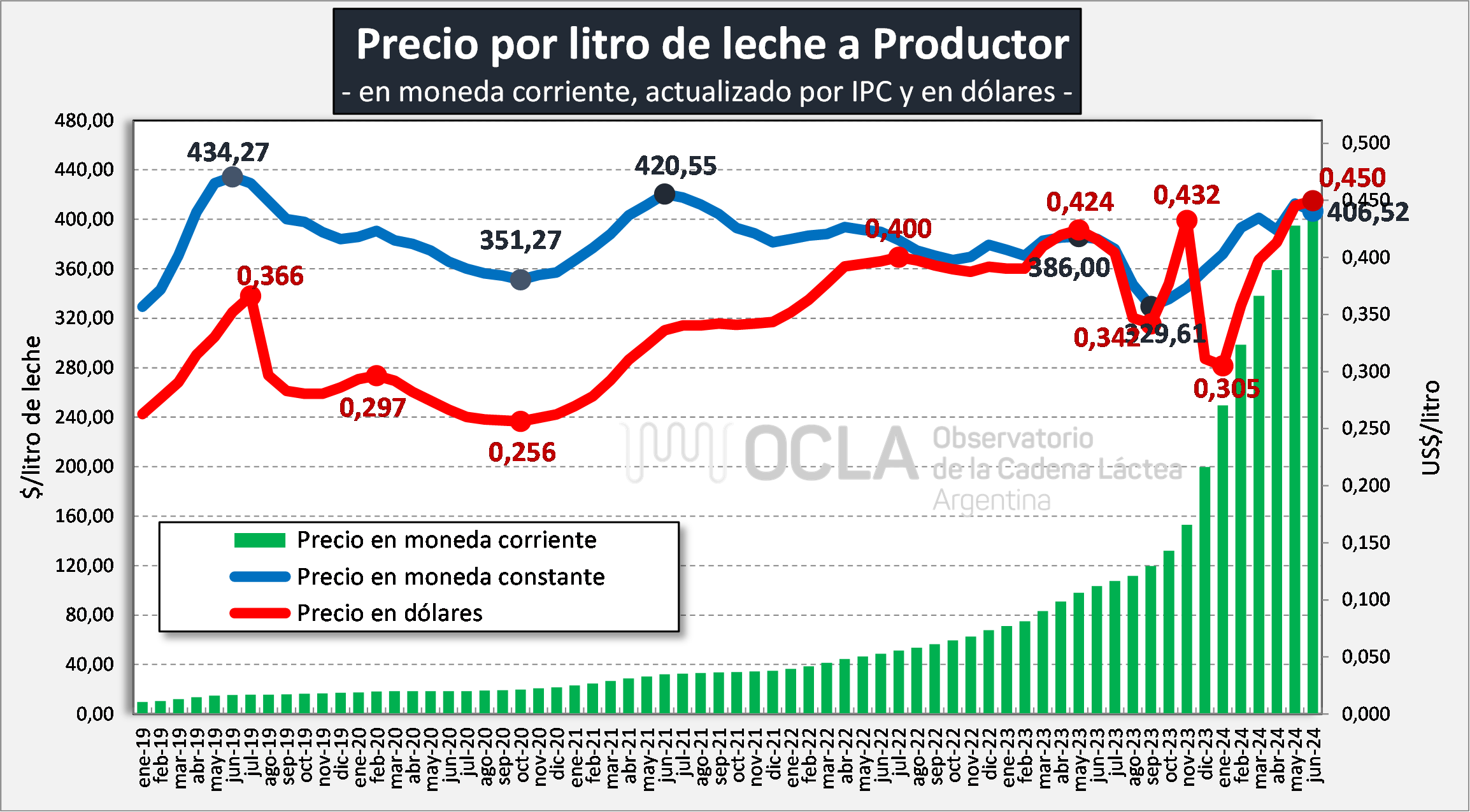 El Observatorio de la Cadena Láctea Argentina (OCLA) publicó los precios de la leche al productor para junio de 2024. El precio SIGLeA se situó en US$ 0,412 por litro, con un promedio de $978,73.